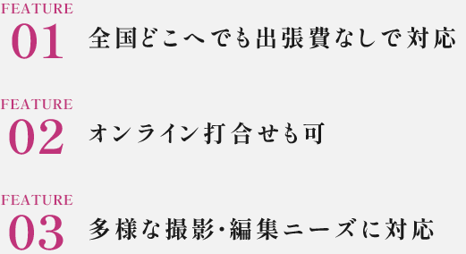 | 編集のみ | 約5〜10万円 | 撮影から約1〜2週間 | 既存素材を活用した編集のみのプラン |